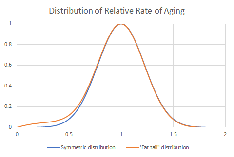 It is the tail ends of that bell curve that has the most information. We will look for a “fat tail” in the bell curve, consisting of an excess of people at the end that suggests very slow aging. We will use data mining and multivariate analysis to find combinations of factors that may account for the especially slow aging achieved by people in this group. If we find factors that are common to this group, then we will have a good candidate for a combination of treatments that is very effective at slowing the aging process. These combinations—if found—will be good candidates for a placebo-controlled trial in the future.